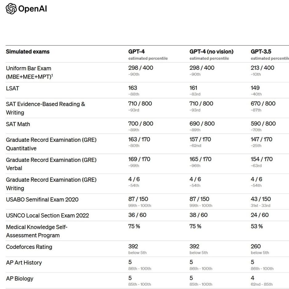 图 | OpenAI:GPT3.5和4的部分考试成绩