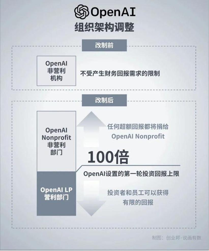 为了彻底解决资金问题,OpenAI调整了结构,一分为二:非营利部门(OpenAI Nonprofit)从事开发技术,营利部门(OpenAI LP)负责商业化,但OpenAI给不同时期进入的投资人设置了各自的盈利天花板。天花板之上,所有的盈利将属于非营利部门。