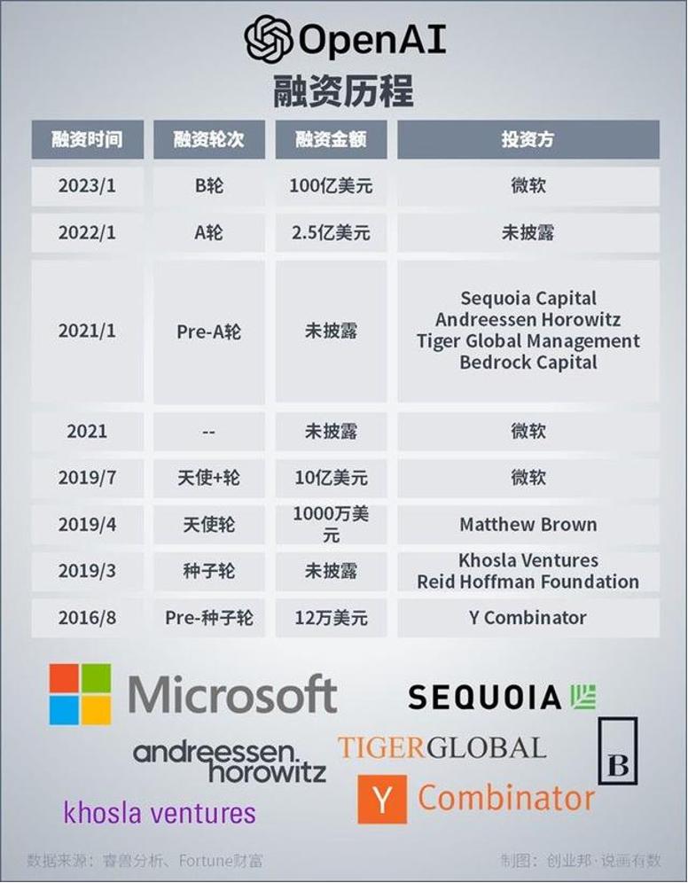 2019年,改制后的OpenAI正式开启融资之旅。据创业邦数据显示,包括最早期投资(比种子轮更早的Pre-种子轮),OpenAI一共进行了8轮融资,涉及9家知名机构和企业,融资总金额约110亿美元。