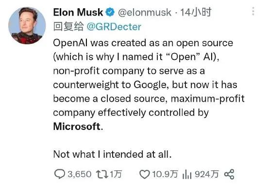 马斯克是OpenAI最早的创始人之一,后期退出。今年2月,他在社交平台上公开批评OpenAI“最初是作为一家开源的非营利性公司而创建的,这也是为什么我把它命名为OpenAI,旨在抗衡谷歌,但现在它已经成一家闭源的营利性公司,并由微软控制……这完全不是我的本意”。