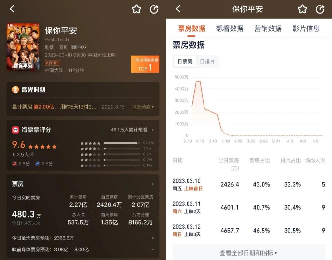 事实上,《保你平安》自2022年即亮相成为了海南电影节的开幕片,便在随后的几轮点映过程中收获不俗口碑,因而当这部电影随后调档来到今年3月份之时,市场便对这部影片有着无限期待,救市之作、票房过10亿的声音不绝于耳。