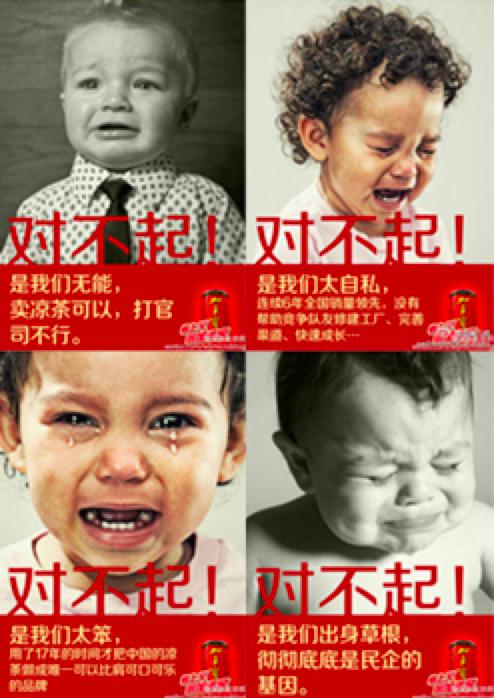 再看一下当年加多宝的公关海报,思考一下为什么他们用受了委屈的孩子作为海报的主视觉?