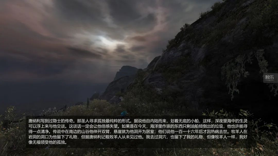 《亲爱的艾斯特》看似提供了一种步行模拟游戏的“定式”:玩家跟随线性的地图不断前进,在固定地点触发对话以推进剧情。这并不意味着开发者可以将所有剧情以旁白形式不加考虑地塞进游戏里,如何在合适的场所触发合适的剧情值得开发者反复考虑。这是一种充满诗意却也隐含逻辑关系的叙述方式:随着景色的变换,旁白的叙述像是对玩家所看见的事物做出评价,或是产生联想。叙事必须与游戏内容紧密相连——在步行模拟游戏当中,这一点尤为重要。合适的节奏与适当留白可以让玩家的注意力在二者之间平滑过渡,不至于过度割裂或是无所适从。