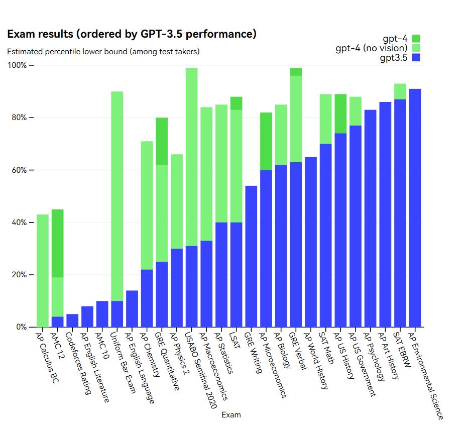 这张图是 GPT-3.5 和 GPT-4 在各项考试中的不同成绩,其中蓝色的是 GPT-3.5,绿色的是升级过后的 GPT-4。