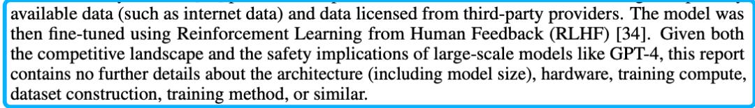 鉴于 GPT-4 等大型模型的竞争性与安全影响,本报告不包含有关架构(包括模型大小)、硬件、训练计算、数据集构建、训练方法等更多详细信息。