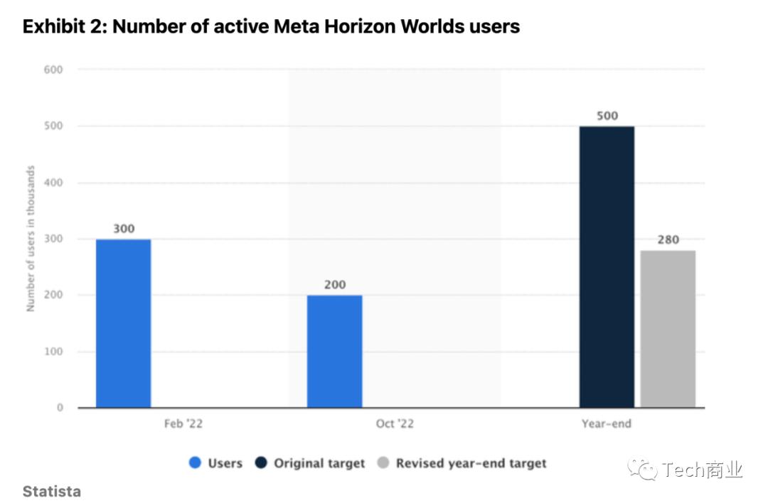 Meta(Facebook母公司) 最近的一些决定引起了人们的猜测,即该公司在公司名称变更后不到 2 年就已经放弃了元宇宙metaverse战略。其中一些现象,包括数字收藏品部分业务的终止和大规模裁员。Meta Horizon Worlds 的失败是投资者认为 Meta 可能将取消元宇宙计划的另一个原因。如下图所示,Meta 在去年 2 月至 10 月期间失去了 Horizon Worlds 的活跃用户,该公司也大幅削减了对全年用户数量的预期。