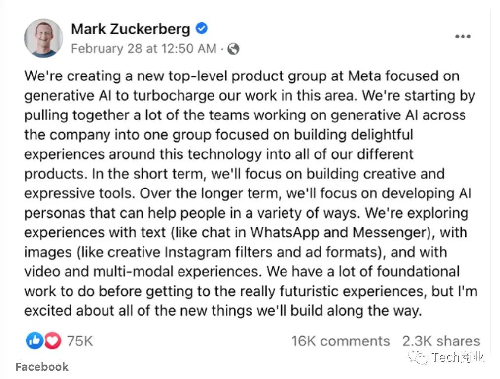 首席执行官扎克伯格上个月在 Facebook 上宣布,将创建一个新的顶级产品组,专注于生成式人工智能,这凸显了该公司在拥抱这项新技术方面的努力。