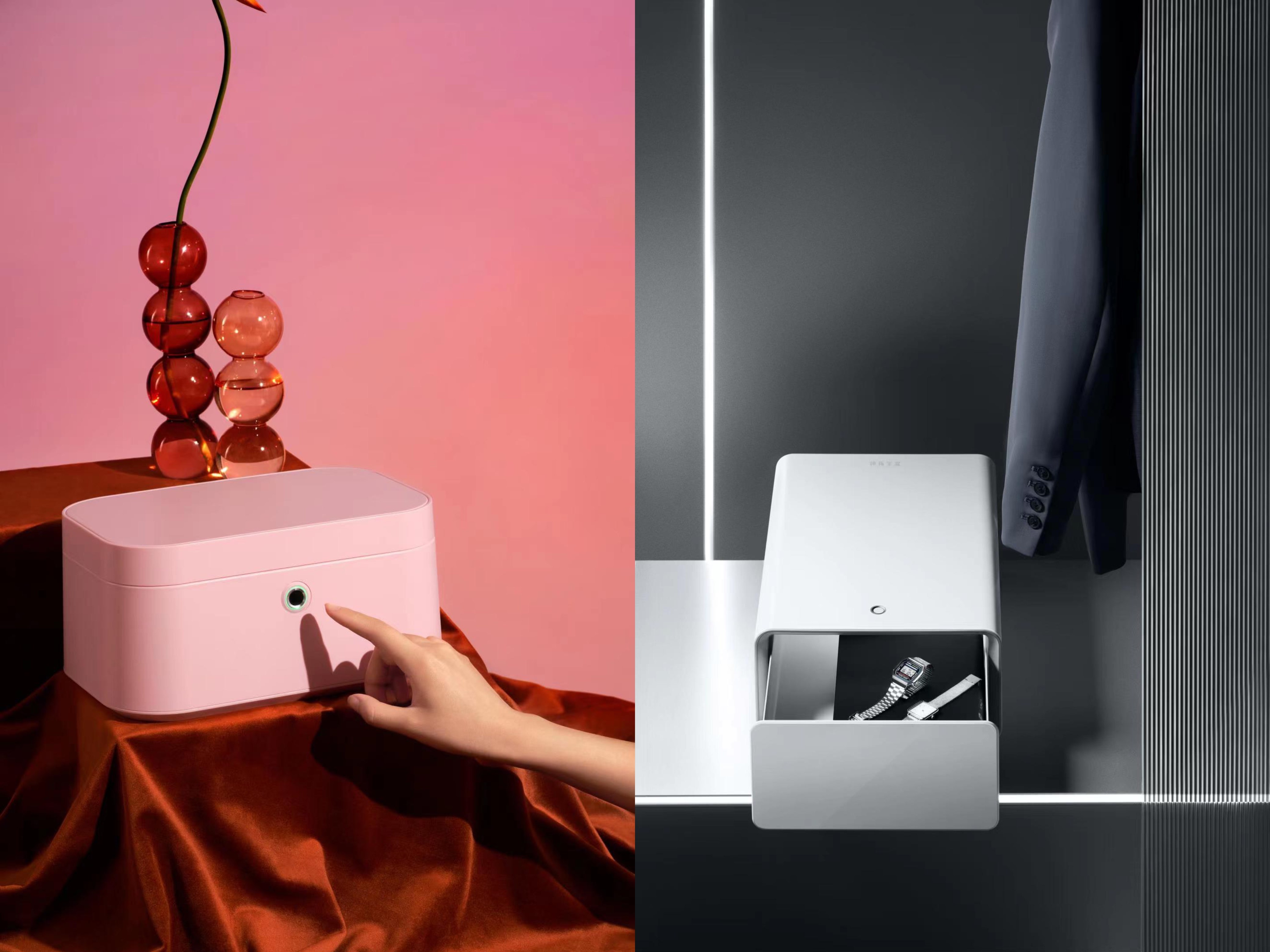 在现场,神指宝盒品牌负责人左希展示了多张产品图片,首饰盒线条流畅,色彩有马卡龙色和复古色调的大胆运用。左希介绍,看起来哑光皮质的表面,其实采用了肤感硅胶消光油工艺,自带轻奢高级感。此外还有金属抽屉形态的指纹保管盒,一体化设计十分简洁,环境适配度高。这个保管盒和首饰盒,都是极简外观,表面只有一个圆形按钮,即指纹锁。