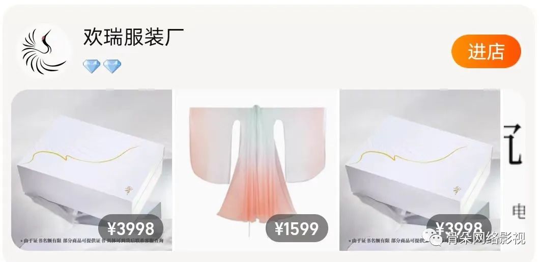 打开“欢瑞服装厂”淘宝店,店中有几十块钱的影视周边香薰片产品,也有近四千元的影视剧同款服装,产品档次有高有低,售价差额不小。另外还有量子泛娱的“南派泛娱正版周边”淘宝店中,售卖的产品也从几块钱的扇子到几百元的手办不等。
