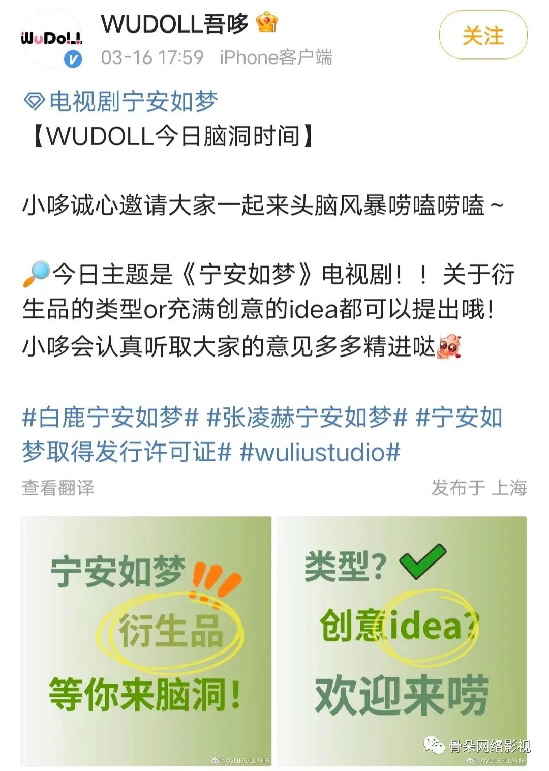 3月14日,吾流文化旗下品牌WUDOLL吾哆发布微博,向粉丝征集电视剧《宁安如梦》衍生品生产创意,不同于已经播出的电视剧在播出后推出与情节相关或剧中同款周边产品,《宁安如梦》这波操作可谓是周边先行于剧。