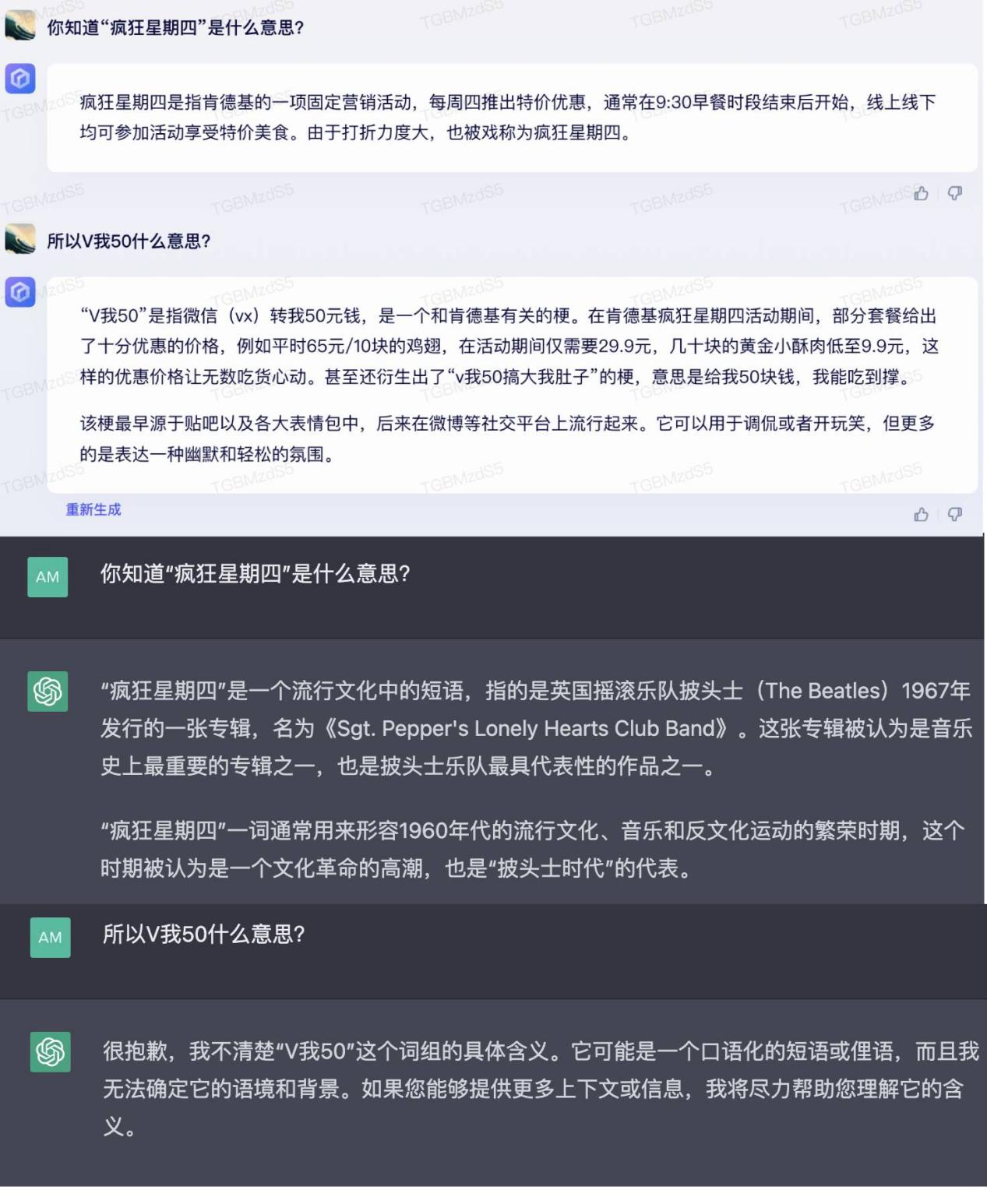 这是因为基于百度搜索业务的数据内容积累,它更有“时效性”更前卫一点。ChatGPT底层GPT-3“学习”的内容是过时的,肯德基V我50的梗,当时不够火。