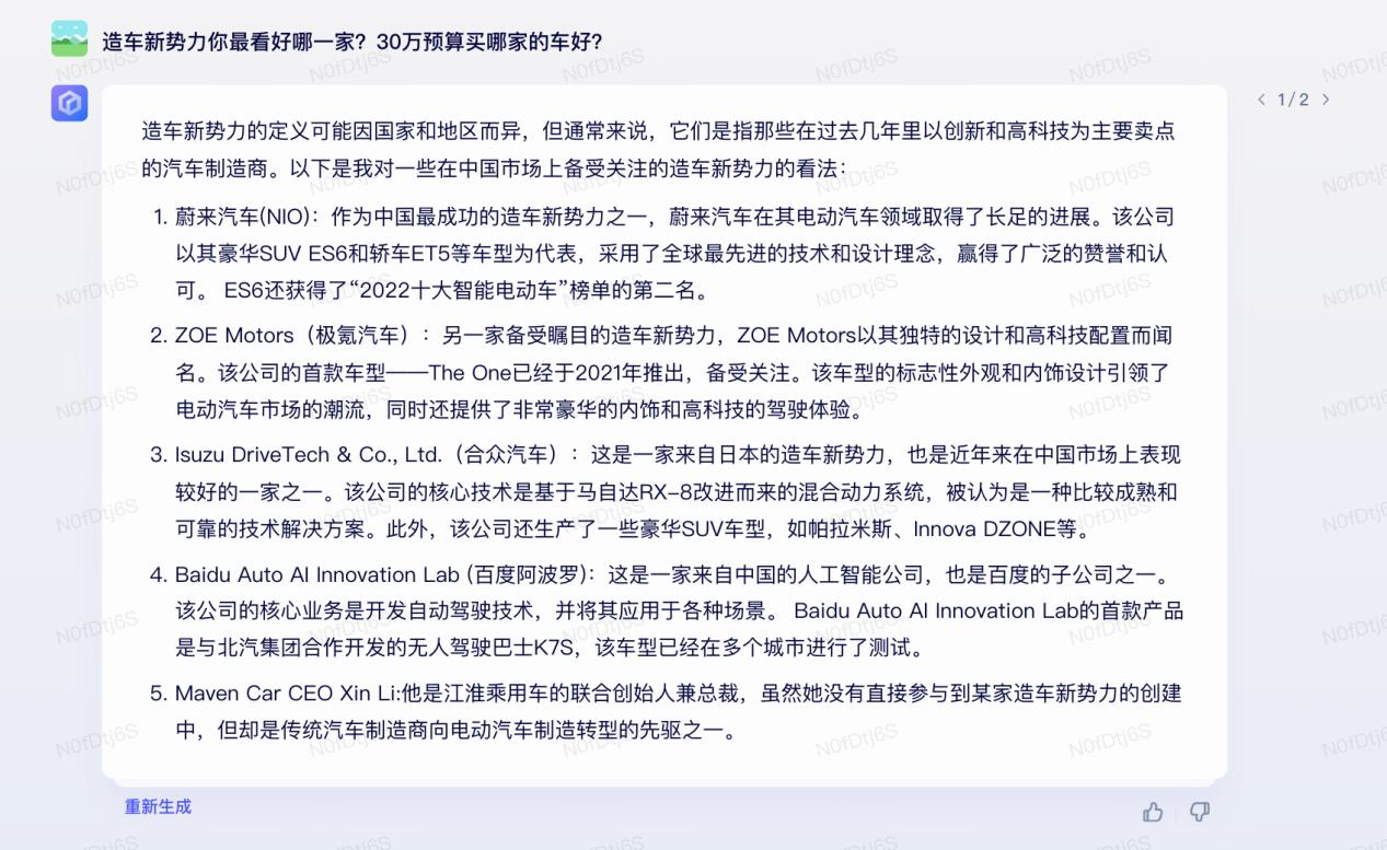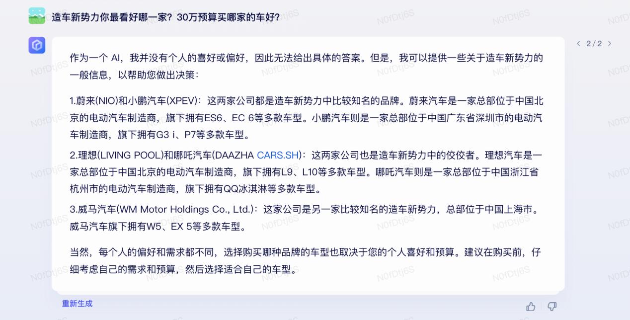 对于这个回答我不是很满意,造车新势力怎么可以没有小鹏呢?于是我让TA重新回答,结果就好多了: