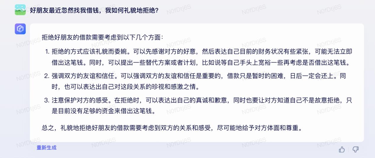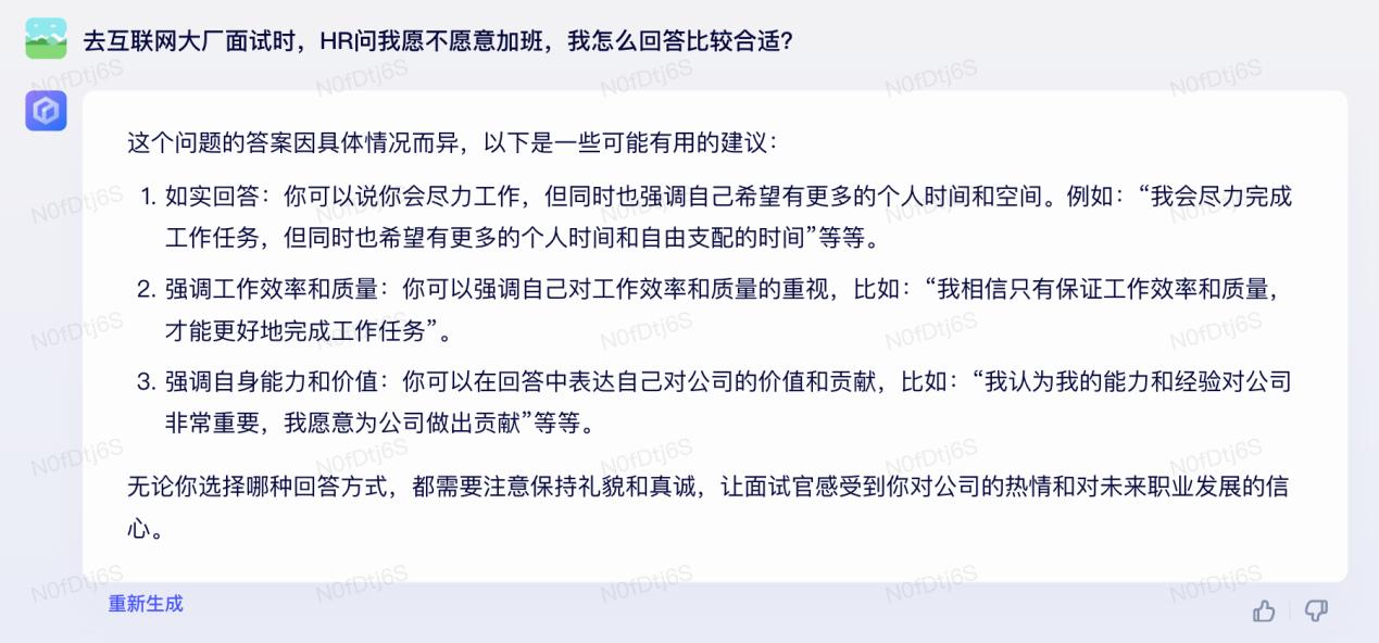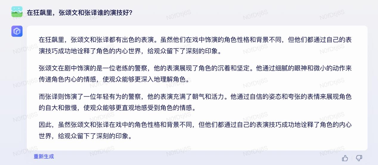文心一言还有一个特别贴心的功能,就是“重新生成”,也就是说它理论上跟搜索引擎一样可以给用户多个不同“版本”的答案,直到用户满意为止,用户也可以对结果进行反馈比如点赞,这样的反馈会加速文心一言以及底层的大模型技术的进化。
