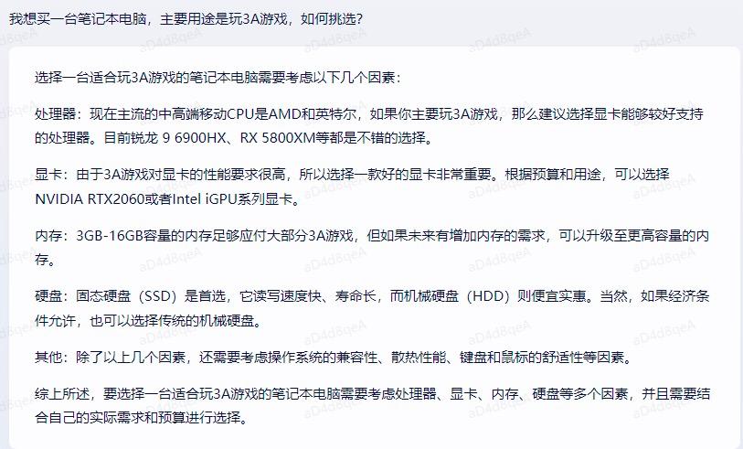 除了可以AI作画外,文心一言还可以给我们的编辑推荐玩3A游戏的笔记本电脑: