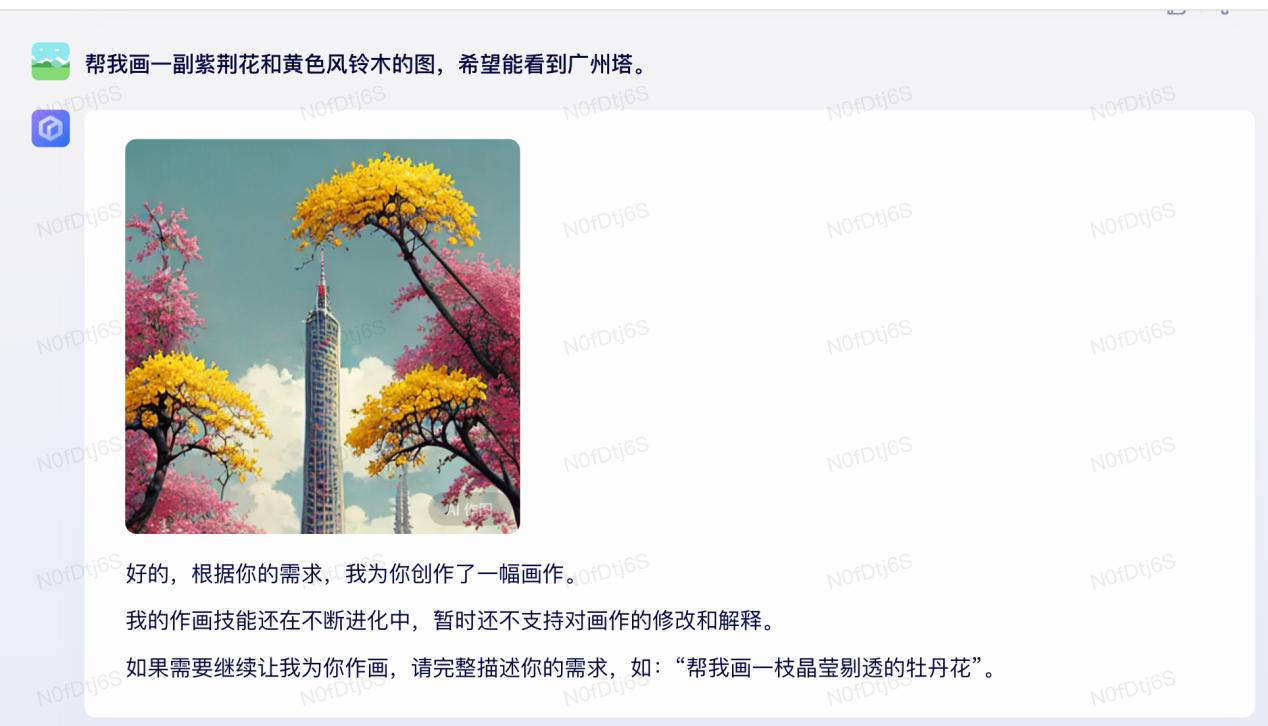 第五个是多模态生成,很多人说GPT-4出来了文心一言没得玩了,其实文心一言的多模态能力很强,语音、图片、视频都能生成,甚至支持方言语音的生成。最近广州是赏花季,满大街都是黄色风铃木和紫荆花,文心一言帮我“记录”了这一刻,虽然广州塔有些抽象,但这张图整体还是很美的: