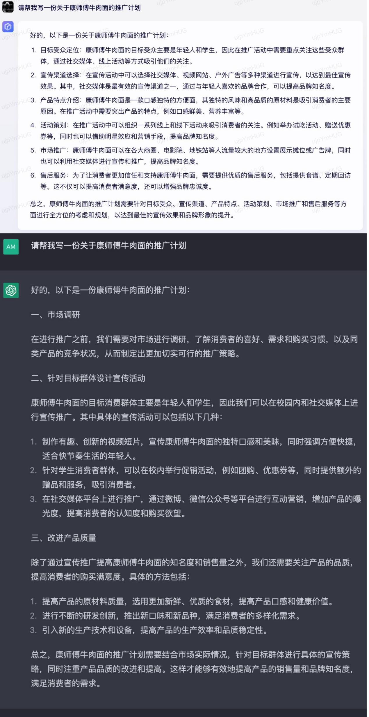 还有,文心一言的辅助创作能力不只是在媒体业体现,在市场营销行业同样有很出色的表现,比如写商业文案的水平也很高了,有的答案算是惊喜,“享受美味,从一碗开始”单单是这句slogan,康师傅就可以给文心一言打赏了,很多结果打工人也可以拿来作为初稿再改改提高工作效率少熬夜: