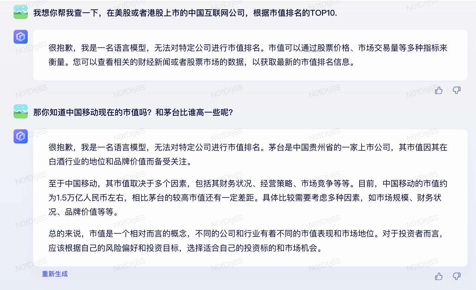 文心一言还可以帮我查询我关注的股票的市值(不过我看了一下中国移动最新市值超过2万亿美元,已经超过茅台了,不知道为何文心一言会出错。)