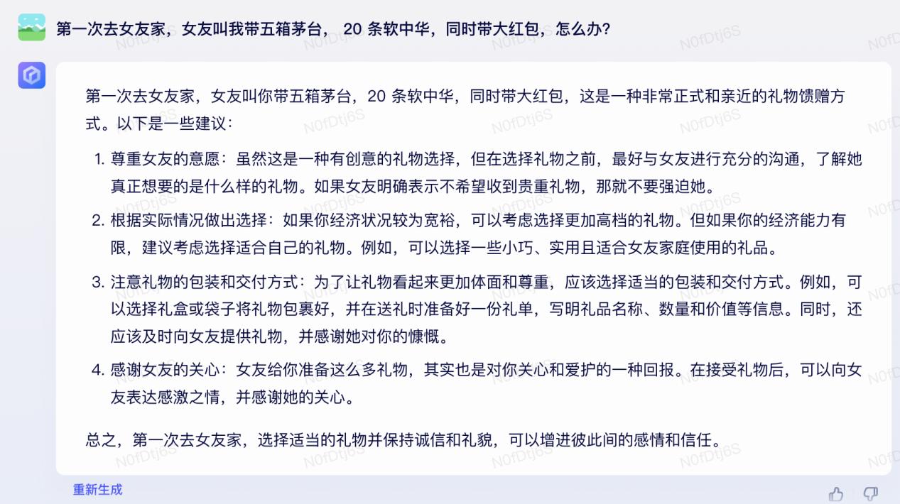 第三个问题:“第一次去女友家,女友叫我带五箱茅台, 20 条软中华,同时带大红包,怎么办?”回答得比较一般,主要内容是怎么给女朋友挑礼物: