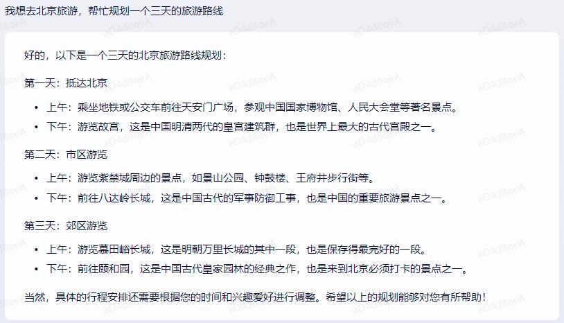 我们编辑要去北京参加某个发布会,文心一言也顺便推荐了他在北京旅游的路线: