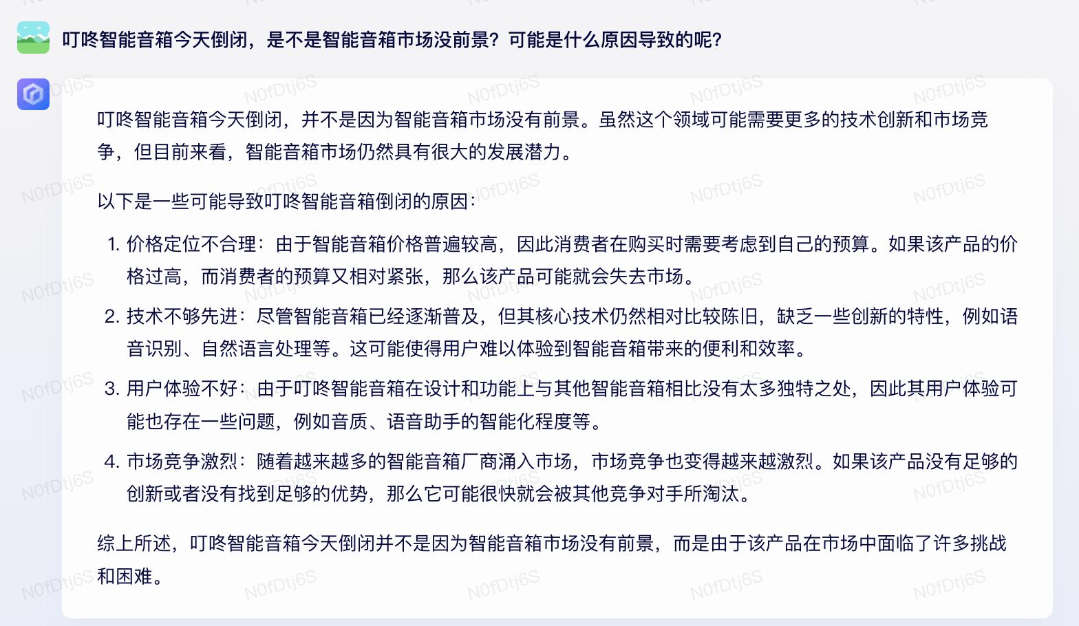 3月17日,第一批智能音箱创业公司叮咚智能音箱宣布停止服务,对此,文心一言也有自己的见解,同时还强调,不是不看好智能音箱市场: