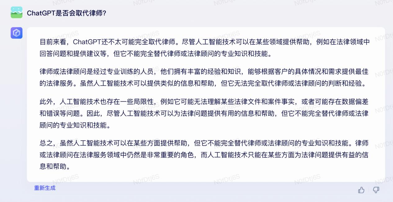 我想试试看,这三个问题文心一言能不能回答?第一个问题:“ChatGPT是否会取代律师?”: