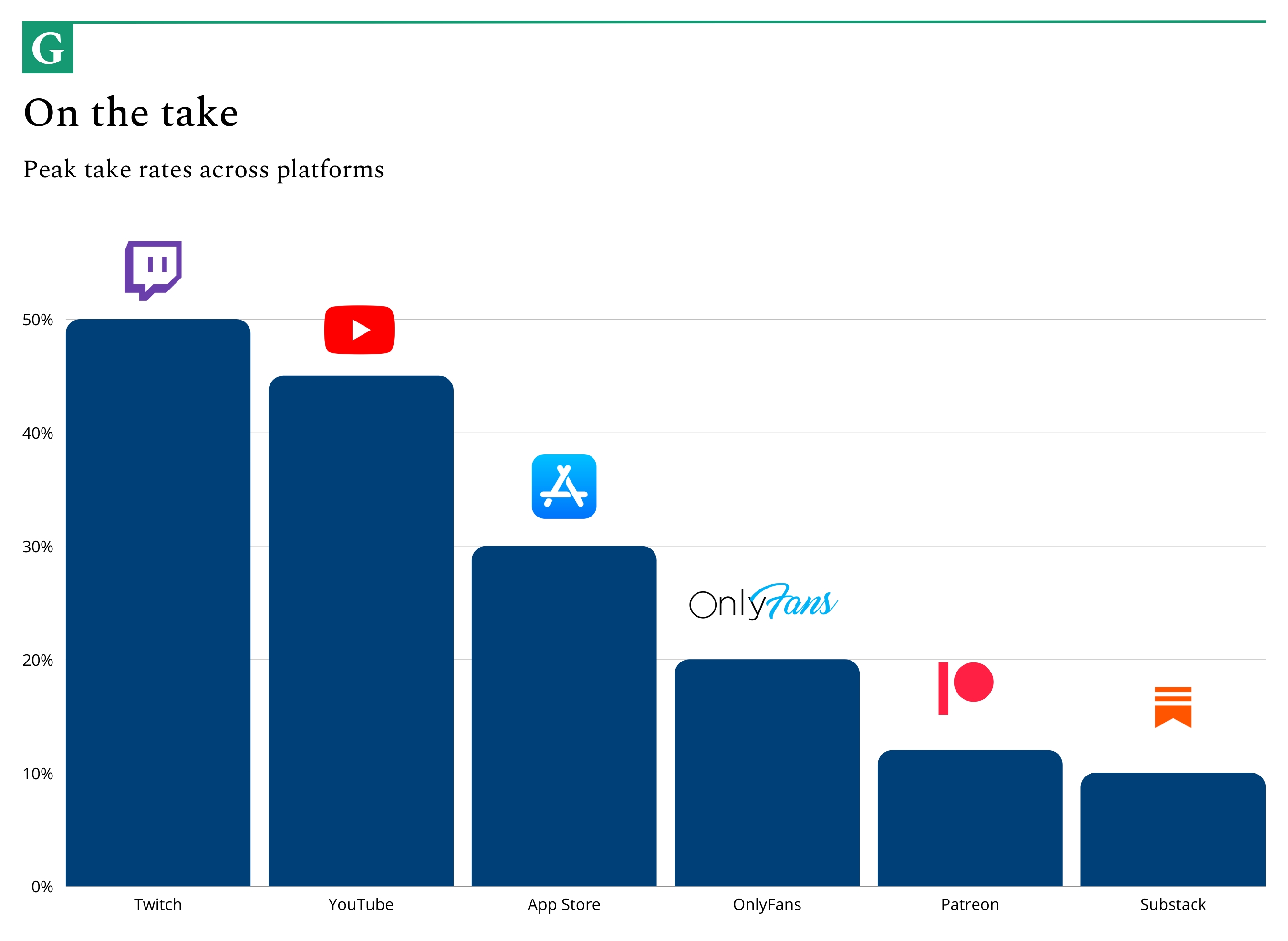 虽然 Substack 的费率听起来似乎很贵,但相对于靠基础业务获得收入的其他平台来说,还是相当经济的。YouTube 和 Twitch 等视频平台的抽佣率高达 50%,苹果的应用商店要拿走 30%,OnlyFans 也要收 20%。 Patreon——一个不太像目的地的平台,也收取订阅费——费率在 5-12% 之间。