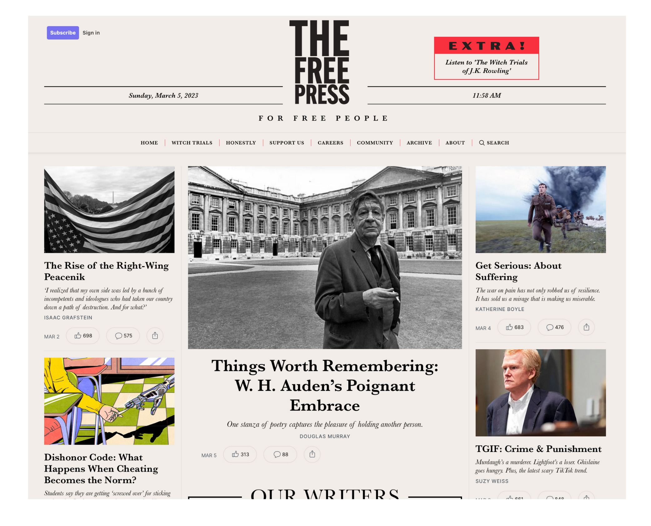 虽然 Substack 还没有完全解决这些问题,但在我们离开的这两年的时间里他们取得的进展还是很显著的。仪表板得到改进,最近的 SEO 升级似乎旨在解决最紧迫的问题。至关重要的是,Substack 还为发行商提供了更多的设计控制权。比方说,Substack 利用不同的字体和背景调色板现在已经很常见。Substack 还与入驻的其中一些最大的发行商合作创建了更广泛、更精细的自定义主题,尽管只是一些个案。比方说,The Free Press 的访问者会看到一个看起来跟传统的 Substack 非常不像的网站;唯一一处明显标志是左上角的“订阅”按钮,看到它你才会跟 Substack 关联起来。