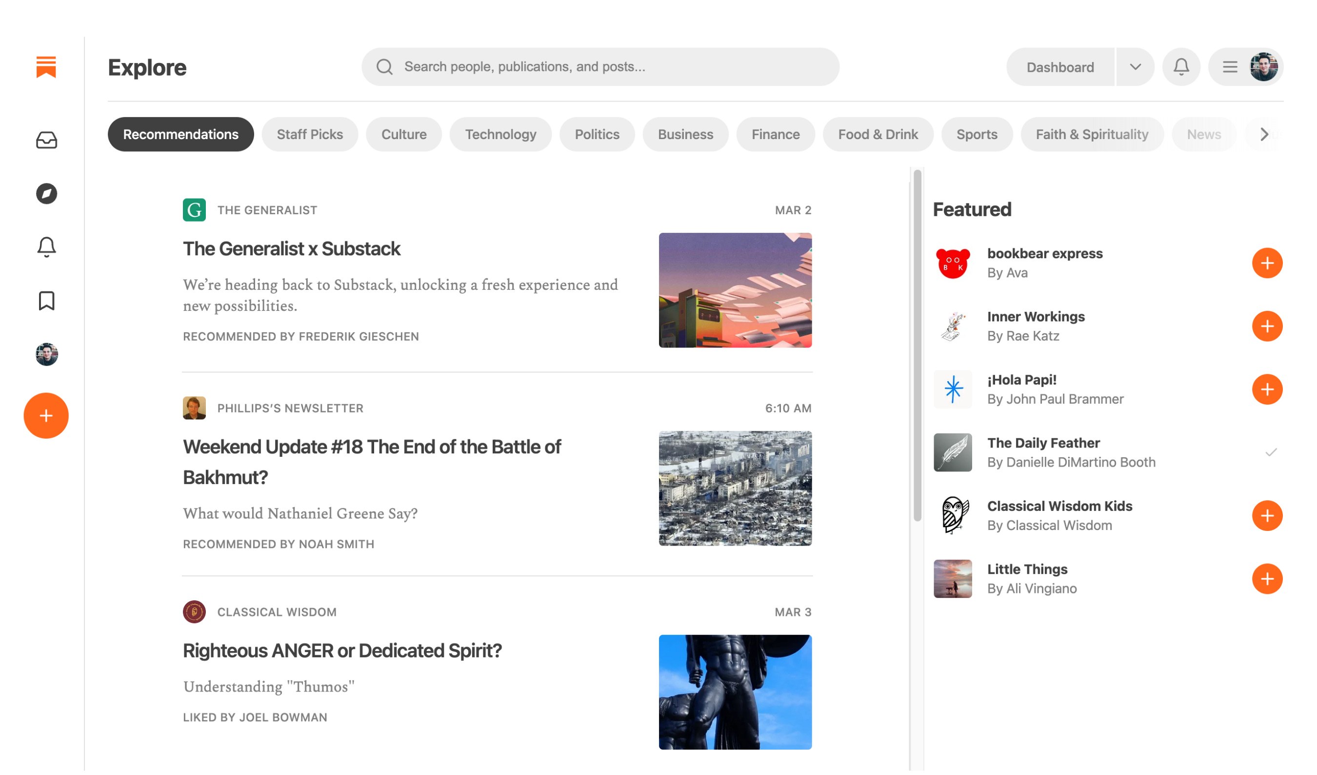 最后,Substack 希望自己能变成一个目的地。事实上,它已经成为互联网的一部分。比方说,我敢打赌,一定比例的技术人员会不带任何预设意图来访问这个网站,就是想上去逛逛。Substack 通过扩大覆盖面以及增加功能来鼓励这种行为。