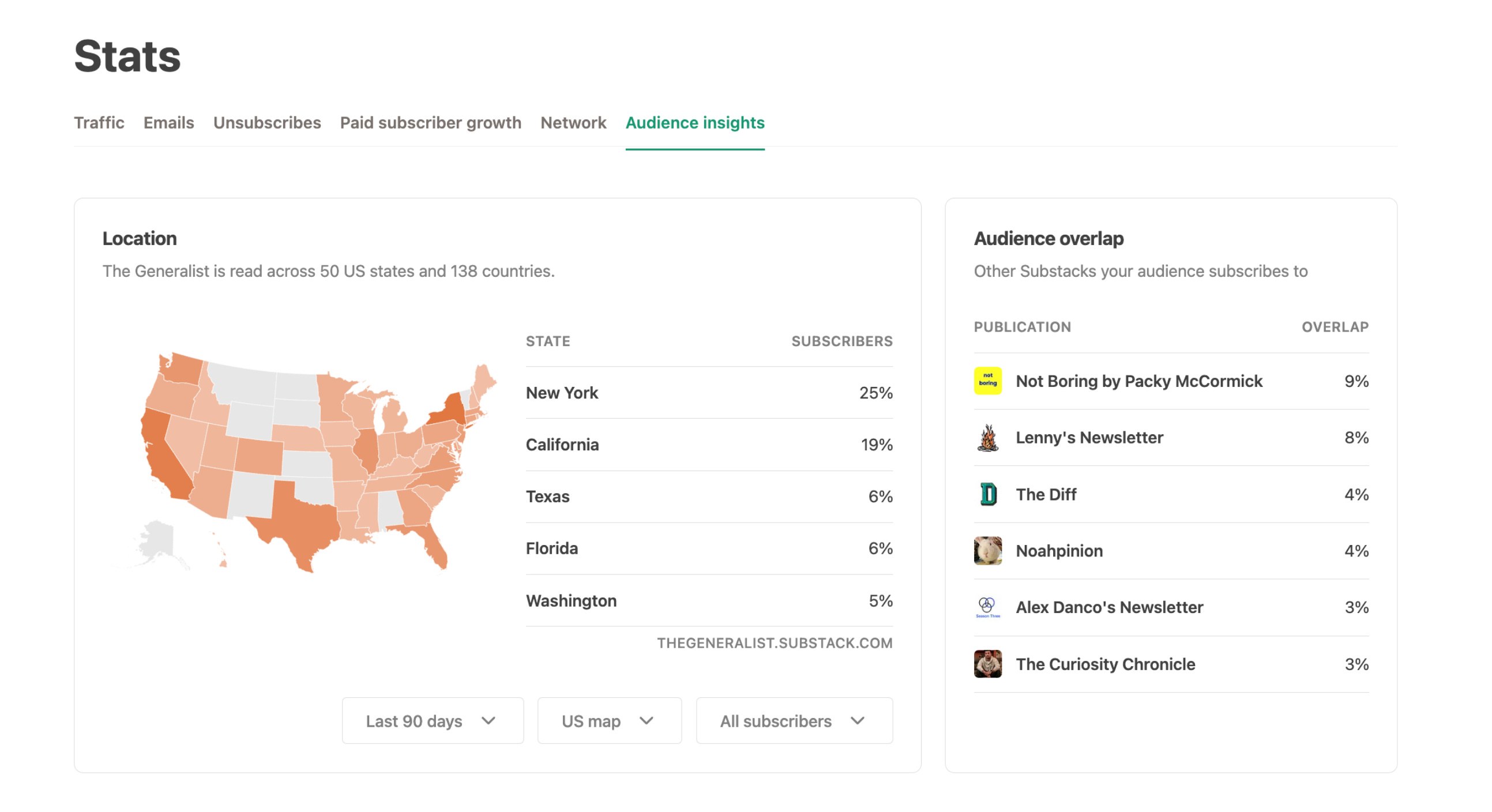 Substack 也会促使作者之间进行协作,即便是以比较微妙的方式。你可以交叉发布其他发行商的作品或提及其他的作者。Substack 的仪表板有个很整洁但不太明显的页面,上面详细列举了受众人口统计数据以及你的出版物与其他出版物的重合度。比方说,The Generalist 与 Not Boring 有 9% 的重合,与 Lenny's Newsletter 有 8% 的重合。很容易想象这些数据会如何促成新的合作和伙伴关系。