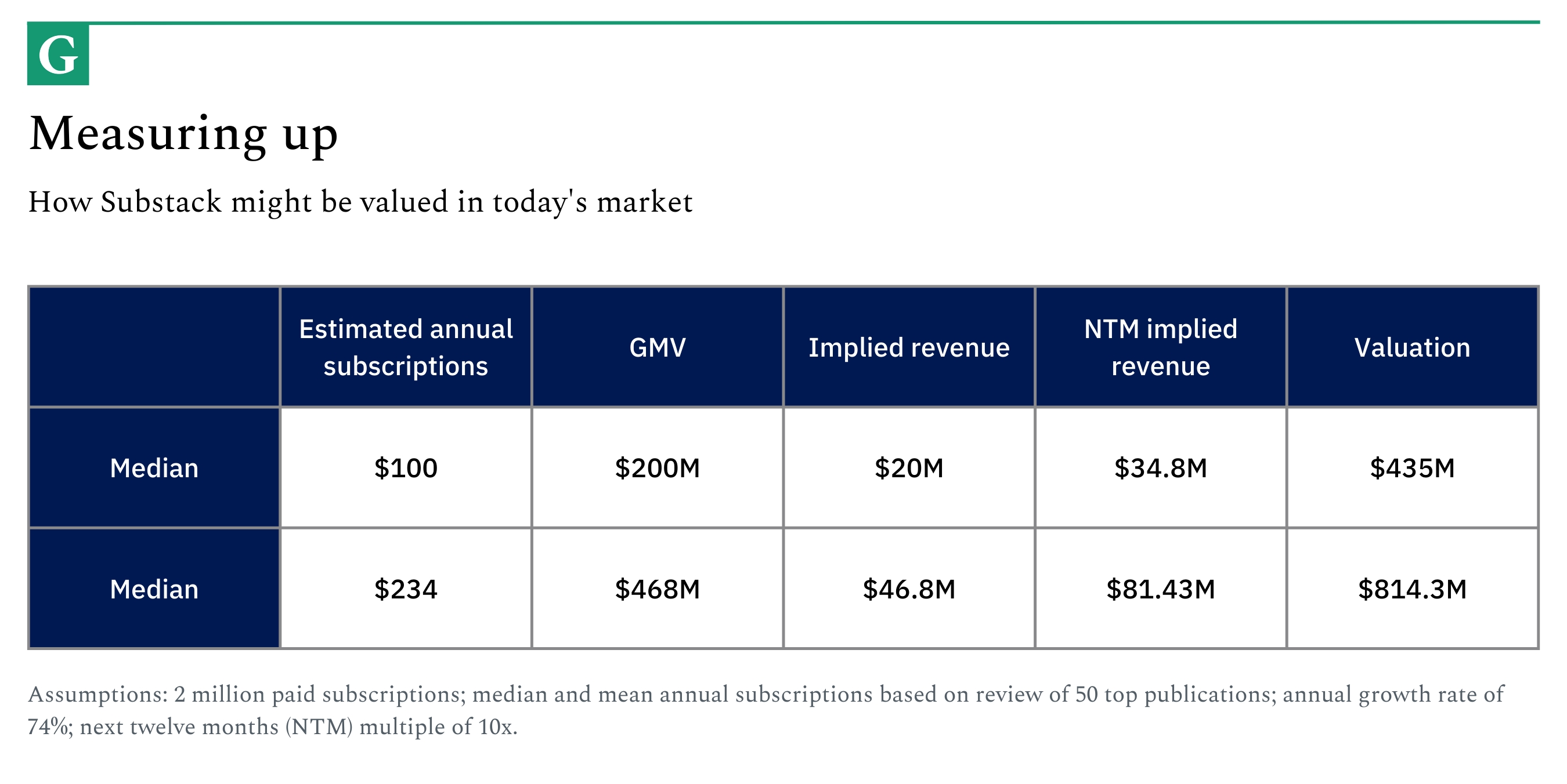 按 10 倍乘数计算的话,Substack 在当今市场上的价值将在 3.48 亿美元至 8.14 亿美元之间。如果我们认为我对其当前收入 2500 万美元的猜测是合理的话,那么 Substack 的估值可达到 4.35 亿美元。(鉴于 Substack 的增长快速,它也有可能拿到更高的倍数,不过这样的增长速度未必能一直保证。)