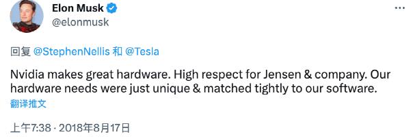 电话会议结束后,马斯克立即在twitter上回应,措辞的塑料友谊感十足:“Nvidia制造了很棒的硬件,高度尊重黄总的公司。”同时又很司马昭地表示:“我们的硬件需求是很独特的,需要跟我们的软件紧密匹配。”