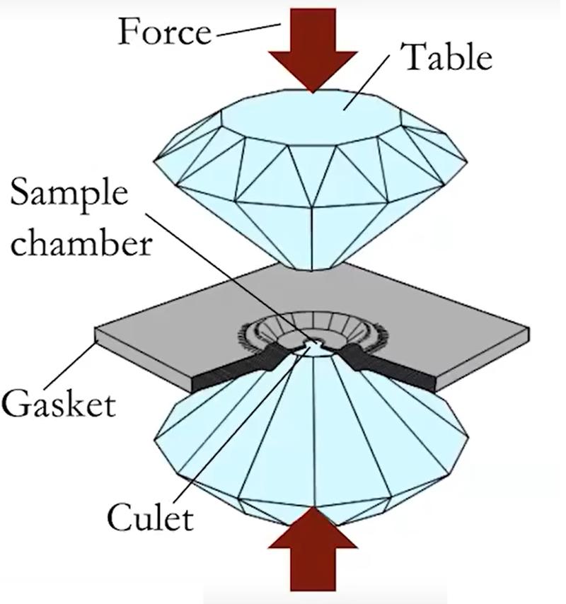 图4:金刚石压砧的基本结构,材料放置于中心的微型腔室内,在外部机械压力下,金刚石对顶砧的接触面积极小,从而实现了极高的压力