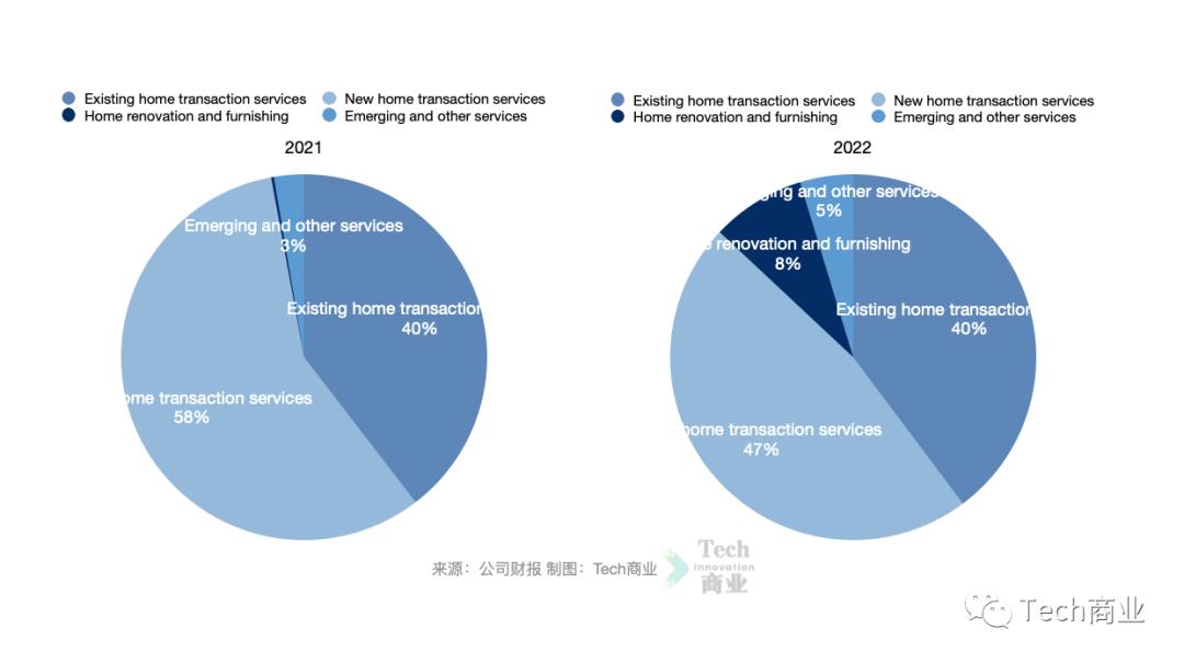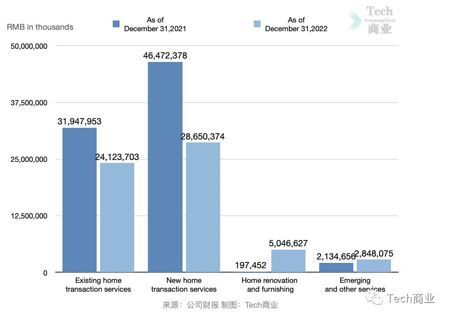 贝壳公司收入来自四分部,包括现房交易服务、新房交易服务、家庭装修和家具收入、新兴服务和其他服务收入。