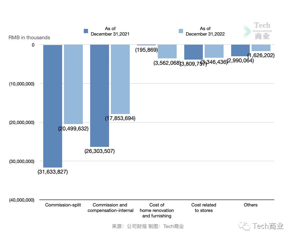 家庭装修和家具收入成本为36亿元。与门店相关的成本为33亿元,成本减少12%,财报称该项成本减少是因为2022年市场下降,链家门店数量的减少。