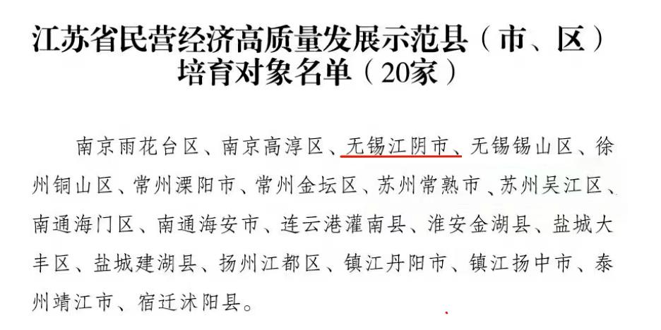 近日,经省委、省政府同意,省发展改革委、省委统战部、省工商联三部门联合公布江苏省民营经济高质量发展示范县(市、区)培育名单,首批共20家,江阴成功入选。