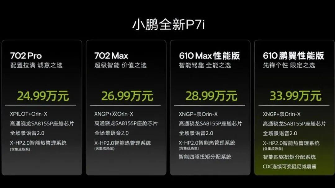 新车P7i的SKU简化为4项,大部分配置全系标配,仅在智能驾驶硬件、加速性能、续航里程上做出区分。