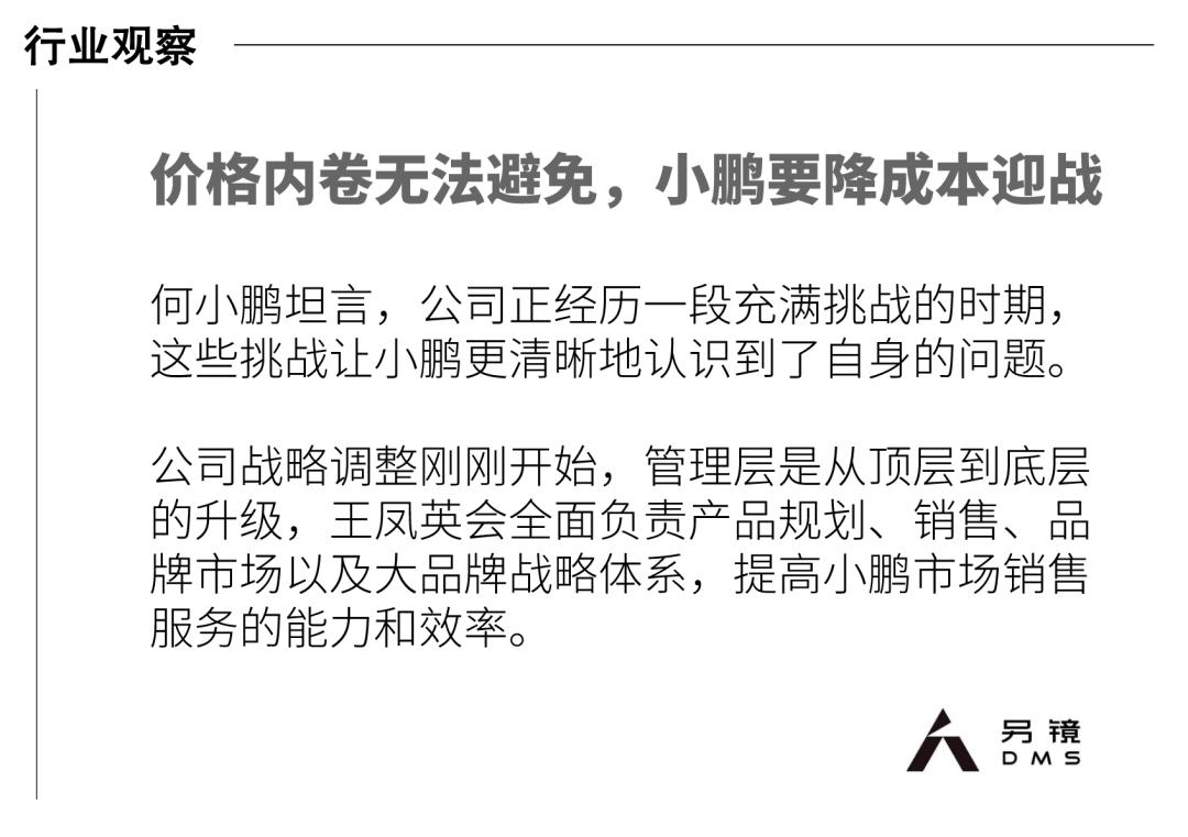 何小鹏坦言,公司正在经历一段充满挑战的时期,这些挑战让小鹏更清晰地认识到了自身的问题。公司战略调整刚刚开始,管理层是从顶层到底层的升级,王凤英会全面负责产品规划、销售、品牌市场以及大品牌战略体系,提高小鹏市场销售服务的能力和效率。