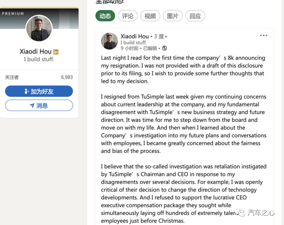 3 月 15 日,侯晓迪在领英发布公开信,说明自己离职的三点原因,包括公司战略存在分歧而被打击报复;不接受图森的重点从 L4 级自动驾驶转移,向 L2 级辅助驾驶;对 CEO 吕程回归的「天价薪酬」条款不满。