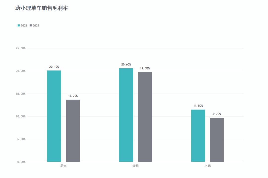 数据显示,蔚来、小鹏、理想2022年净亏损分别达到 144.37 亿元、91.4 亿元、20.32 亿元。结合毛利率来看,蔚来、小鹏、理想分别为 10.4%、11.5%、19.4%。