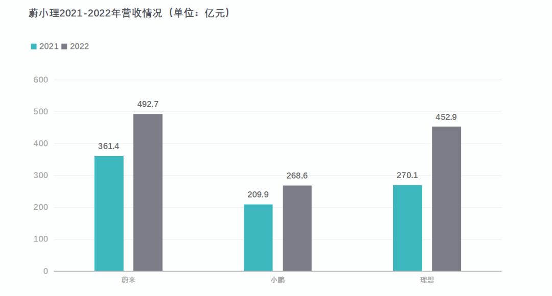 根据财报显示,销量规模的快速扩大带动了营收的大幅增长。在营收层面,蔚小理三家在营收上实现了不同程度的增长,其中蔚来营收规模最大,达 492.7 亿元,同比增长36.3%;理想和小鹏分别为 452.9 亿元、268 亿元,同比分别增长67.7%和27.9%。与之对应,它们卖掉的新车数量分别是12.25万辆、13.32万辆、12.08万辆。