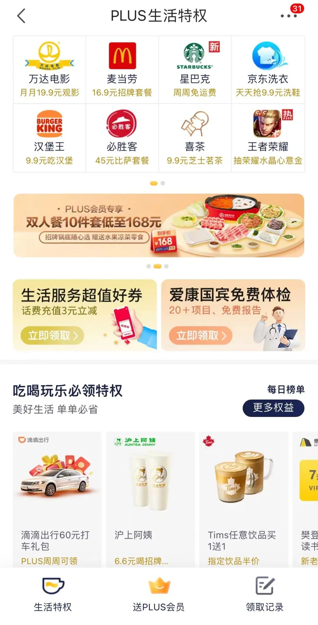 例如,如果把PLUS当做一个电商会员,可以获得网购的优惠券、运费券等;如果把PLUS当做一个餐饮会员,可以在肯德基、麦当劳、汉堡王、星巴克、喜茶等享受各种折扣福利;如果把PLUS当做一个出行服务会员,又可以获得各类酒店、航空公司的出行礼包……