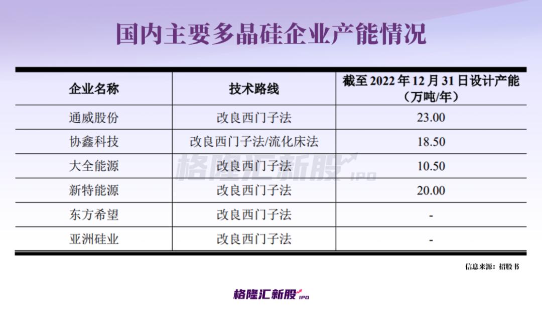 市场竞争格局方面,据招股书,2021年国内年产能在5万吨以上的企业仅有5家,包括通威股份、协鑫科技、大全能源、新特能源、东方希望,产能共计44.1万吨,占国内多晶硅产能的85.0%,行业集中度较高。