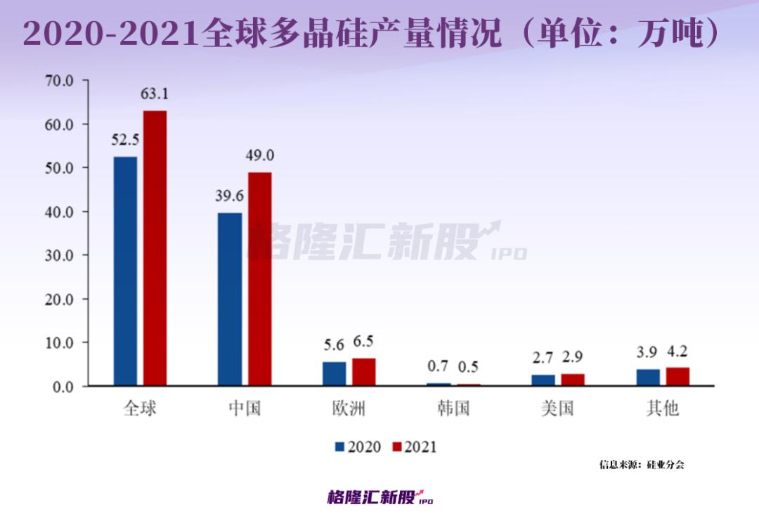 众所周知,高纯多晶硅是光伏组件制造的基础原材料,处于光伏产业的上游环节。据统计,2021年全球多晶硅产量达到63.1万吨,同比增长20.2%,其中光伏领域消耗多晶硅61.4万吨。