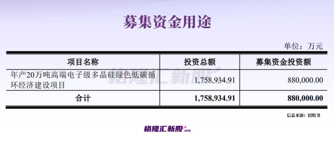 本次冲刺A股,公司拟募资88亿元,用于投资年产20万吨高端电子级多晶硅绿色低碳循环经济建设项目。