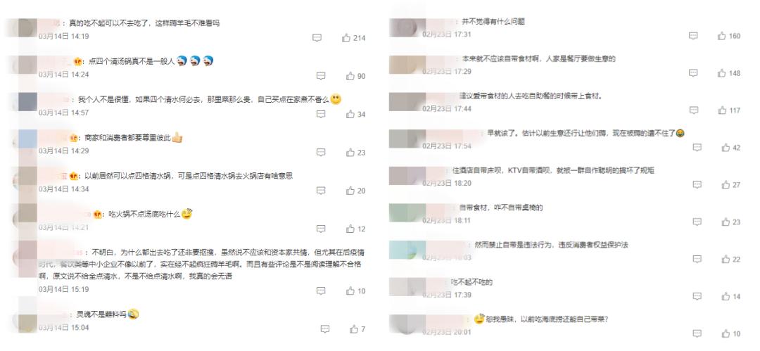 那么,对于原本就不会自带食材,不会只点四个清水锅的消费者来说,此次热搜不过是觉得“哦,原来还能这样啊”,一笑而过罢了。