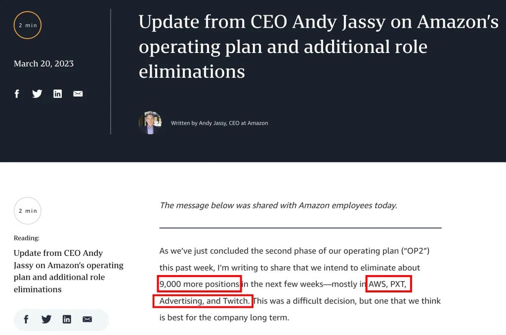 智东西3月21日报道,当地时间周一,亚马逊CEO安迪·贾西(Andy Jassy)在员工备忘录中宣布,该公司在未来几周内将裁员9000名,主要涉及亚马逊云科技(AWS)、负责人力资源的“人员、体验和技术”(PXT)部门、广告、游戏流媒体平台Twitch。