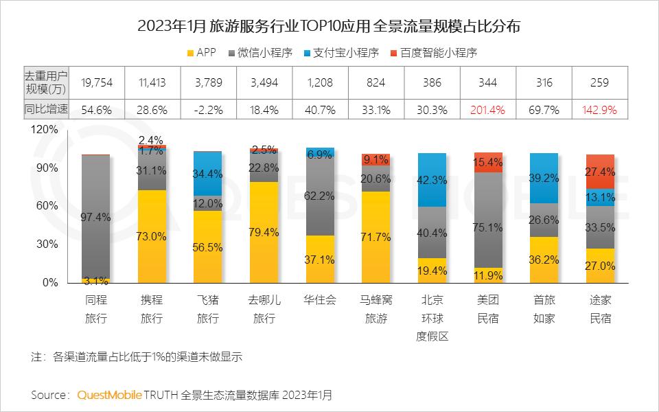 QuestMobile数据显示,同程旅行、携程旅行用户规模行业领先,全景流量均超1亿;民宿市场增长火爆,美团民宿、途家民宿全景流量增速分别为201.4%、142.9%。