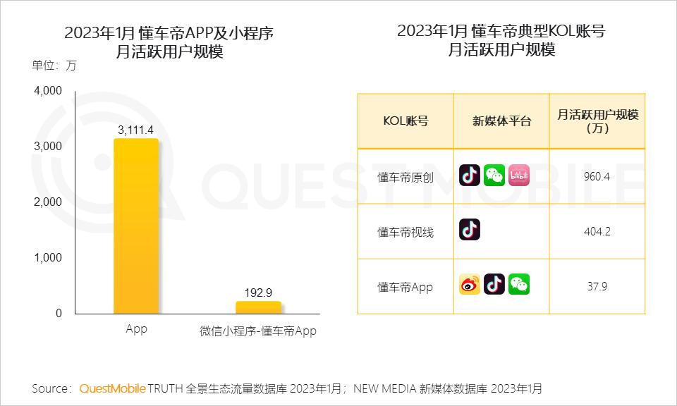 懂车帝在APP、小程序流量之外,通过矩阵KOL账号布局新媒体平台,取得良好收效,QuestMobile数据显示,2023年1月,懂车帝旗下懂车帝原创、懂车帝视线KOL账号月活跃用户规模分别为960.4万、404.2万。