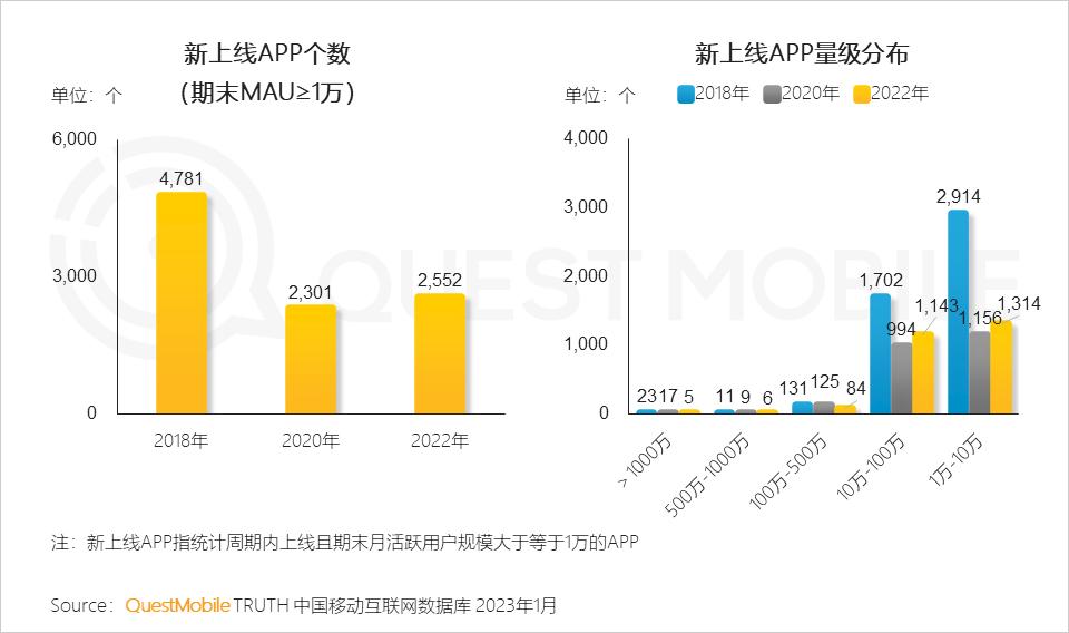 QuestMobile数据显示,2022年新上线APP数量共2,552个,虽较2020年略有增长,但与2018年相比数量近乎减半,且新上线APP实现量级突破难度提升。
