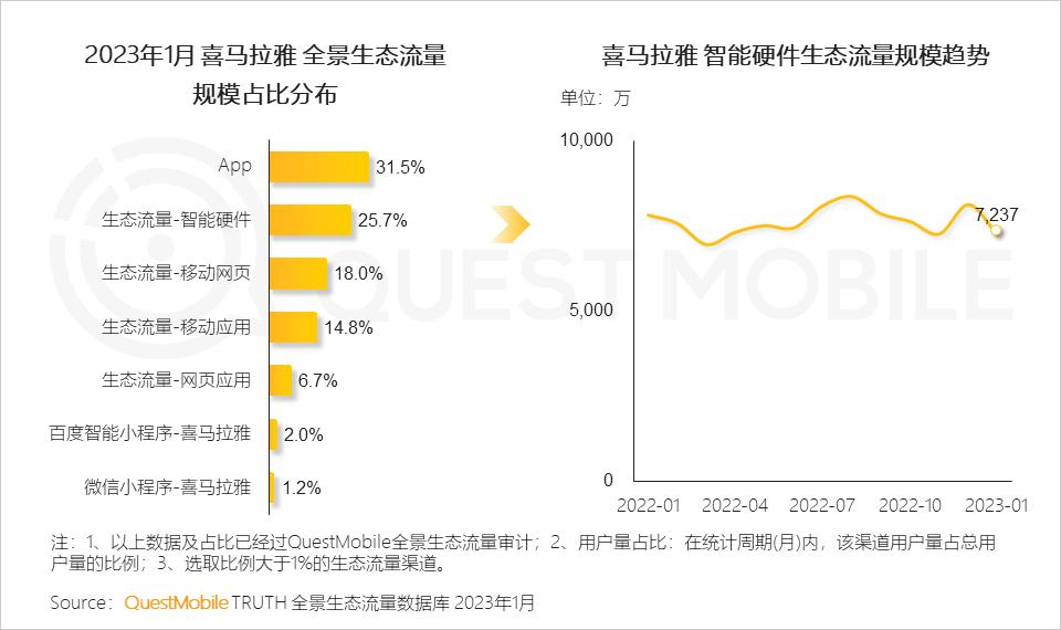 QuestMobile数据显示,截止2023年1月,喜马拉雅智能硬件生态流量达7,237万,占其全景生态流量的25.7%。